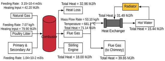 Energy flow analysis is an effective tool to perform an analysis and to propose sustainable systems. As shown in Figure 8, a schematic diagram, the energy production and heat flow during the co-combustion process in the lab-scale biomass conversion system was analyzed.