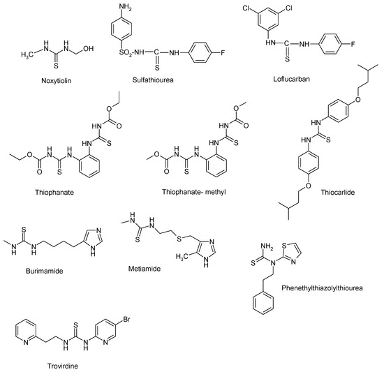 Representative structures containing a thiourea fragment for non-nucleoside reverse transcriptase inhibitors (NNRTIs) are phenethylthiazolylthiourea [9] and trovirdine [10]. The thiourea derivatives with different pharmacological properties are summarized in Figure 1.