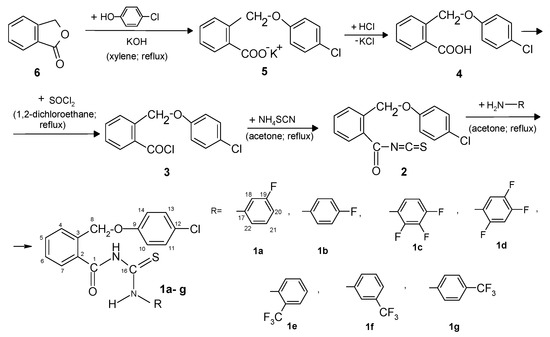 The new compounds (1a–g) with the thiourea skeleton were prepared according to the Figure 2, from 2-(4-chlorophenoxymethyl)benzoyl isothiocyanate (2) and primary amines. The isothiocyanate was obtained by reaction of 2-(4-chlorophenoxymethyl)benzoyl chloride (3) with ammonium thiocyanate. Also, the acid chloride was obtained from 2-(4-chlorophenoxymethyl)benzoic acid (4) by refluxing with thionyl chloride in anhydrous 1,2-dichloroethane. The acid (4) resulted by treating with hydrochloric acid the potassium salt of 2-(4-chlorophenoxymethyl)benzoic acid (5) obtained from reaction of phthalide (6) with potassium p-chlorophenoxide in xylene.