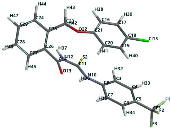 Tube representation of the optimized molecular structure of 2-((4-chlorophenoxy)methyl)-N-(4-trifluoromethylphenylcarbamothioyl)benzamide (1g). (the numbering of the atoms was done according to the software).