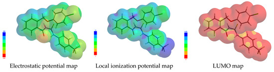 In Table 1, there are given the calculated molecular properties and common descriptors used in quantitative structure and activity relationship (QSAR) analysis, based in the electron density and the electrostatic potential: weight, energy, area, volume, ovality, polarizability, water-octanol partition coefficient (logP), polar surface area (PSA), dipole moment, energy of the frontier molecular orbitals (FMOs)-the highest occupied molecular orbital (HOMO), and lowest unoccupied molecular orbital (LUMO), along with their energy gap (ΔE). These characteristics were discussed in order to assess the drug-likeness in terms of oral bioavailability according Lipinski’s rule of five (RO5) [55] and are useful for further molecular docking studies, to assess the flexibility and the binding ability of studied conformers to bind to the receptor protein. Calculation were performed on the isolated molecules, in gas, at equilibrium geometry in ground state, for the lowest energy conformer, that present an energy minimum in all dimensions. Area, volume, polar surface area (PSA), and ovality are resulted from a space-filling model. Area and volume increase as expected, with the molecular weight of the compounds. Ovality represents a measure of deviation from a spherical shape, where 1.0 is associated with the sphere model and values >1.0 indicate deviation. The magnitude of the dipole moment is also reported. Greatest dipole moments suggest larger separation of charges. Polarizability and logP are descriptors based on the electron density surface. The smaller value of dipole moment exhibits the compound 1e (4.15) and the greater, 1g (7.92). Differences in structures are done by the number of fluorine atoms and their positions. This fact is reflected also by the obtained values of logP for compounds 1a-b, 1c-d, and 1f-g, respectively. Same similarity in values are obtained for polarizability, also. The difference in energies between the HOMO and LUMO (ΔE) is of great interest when evaluate the reactivity of molecules and their kinetic stability. Lower energy gap conducts to enhanced stability of the molecule. The smallest values for frontier molecular orbitals present the compound 1e, followed by 1d, suggesting their greatest kinetic stability among the others. Also, these compounds, have shown no interactions with amino acids residues of the active site where docked.