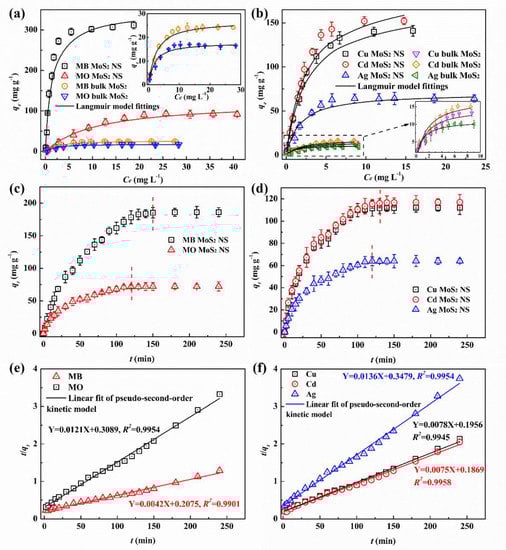 - Qiao, X.-Q.; Tian, F.-Y.; Hou, D.-F.; Hu, F.-C.; Li, D.-S. Equilibrium and kinetic studies on MB adsorption by ultrathin 2D MoS2 nanosheets. RSC Adv. 2016, 6, 11631–11636. [Google Scholar] [CrossRef]