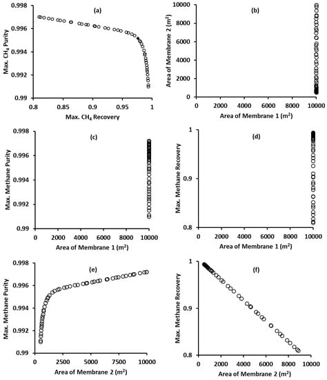 Figure 2 illustrates the results of optimizing a membrane process for CO2 removal from natural gas. Figure 2a depicts the optimal trade-off of the two objectives: maximize methane purity and maximize methane recovery, simultaneously. Figure 2b is the plot of decision variables—membrane 1 area and membrane 2 area—in the decision variable space. It shows that the optimal value of the membrane 1 area is at its upper bound of 10,000 m2, which means that both objectives improve if this bound is increased further, but within a practical limit. On the other hand, the optimal value of the membrane 2 area varies from a low value (but above its lower bound) to its upper bound of 10,000 m2. The variation of objectives with decision variables is presented in Figure 2c–f. For example, Figure 2c is a plot of methane purity versus the membrane 1 area. Figure 2c,d indicates that the membrane 1 area affects both objectives in the same direction, whereas Figure 2e,f show that the increase in the membrane 2 area increases methane purity but decreases methane recovery.