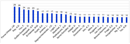 Figure 4 shows that there are 24 researchers, each of whom contributed 10 or more journal papers to MOO and its applications in CPE, from the year 2000 to the end of October 2019. Of them, the top 2 researchers (co-)authored 29 and 28 papers, and each of the next 4 researchers contributed 21 to 24 papers. Among the researchers in Figure 4, G.P. Rangaiah and K. Hidajat have been with the National University of Singapore (NUS), A.K. Ray was with NUS before he moved to the University of Western Ontario, and S.K. Gupta was also with NUS for two years on leave from Indian Institute of Technology (IIT) Kanpur.