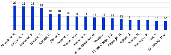 Figure 5 indicates an exponential rise in the number of journal papers containing multi/bi and objective and optimization/optimisation in the title/abstract/keywords from just a few in the year 2000, 62 in the year 2010, to 518 in the year 2018. This number for the year 2019 is likely to exceed 700. Figure 6 shows that there are 18 researchers, each of whom contributed 10 or more papers found in the search. Of them, the top four researchers (co-)authored 27 to 24 papers, and each of the next two researchers 18 papers. A few of these researchers contributed to many papers in the ChE subject area as well (Figure 4). These are not repetition, since the journals chosen in the ChE subject area (Table 2) are different from those in the Energy subject area (Table 3).