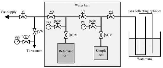 Schematic representation of the experimental apparatus [28]: V denotes the valve; PG is the pressure gauge; PGV is the pressure gauge valve; VG is the vacuum gauge; VGV is the vacuum gauge valve; VV is the vacuum valve; RCV is the reference cell valve; SCV denotes the sample cell valve.