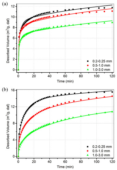 The reduction of diffusivity in the ZG coal with increasing particle size may be due to a larger particle-size-induced diffusion path, which requires a longer passage time. Coals with fine particles can achieve complete desorption more quickly and desorb more CH4 in the same period, as compared to coals with coarse particles. This is important for CBM recovery. As CBM production proceeds, CH4 desorbs and diffuses through the pore system to the cleats, and then migrates into the well or borehole. Since the desorption time is negligible [8,30], CBM production efficiency is determined by the diffusion in the pore system and laminar flow in the cleat system. The former is controlled by the diffusivity and the latter by the permeability. Hydraulic fracturing is normally used to accelerate CBM production. This technique not only can increase permeability but also diffusivity by cracking the coalbed and reducing the path for diffusion.