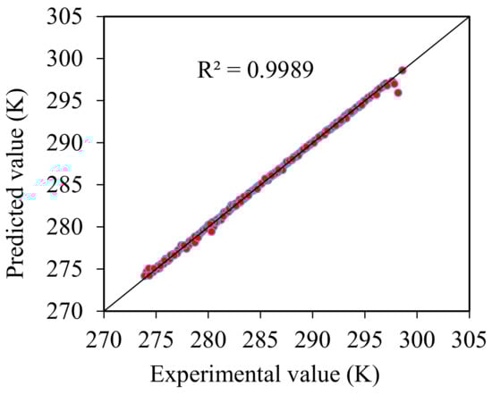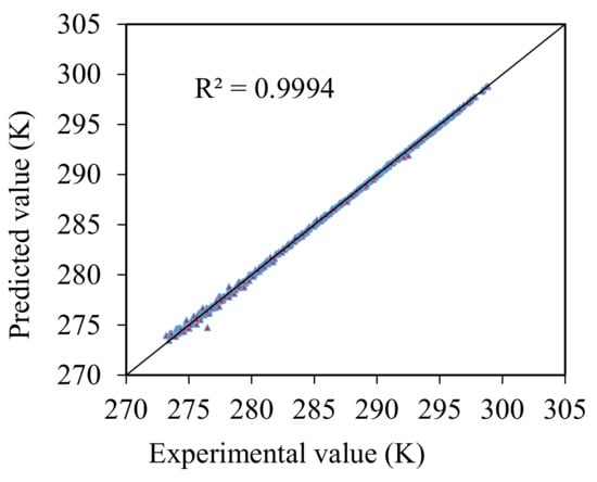 As shown in Figure 2 and Figure 3, the GA-SVM model exhibited good training and prediction results. The predicted and experimental values are evenly distributed around the 45° line, and the correlation coefficient (R2) is greater than 0.99. Thus, the model has good calculation accuracy and generalisation ability for predicting the natural gas hydrate formation conditions.