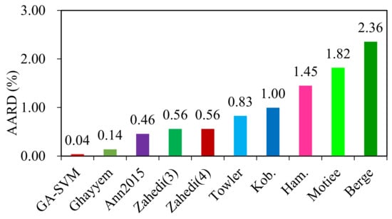 To further evaluate the GA-SVM model, according to the calculation results of all the data points (688), the GA-SVM model was compared with the Ghayyem [], Ann2015 [], Zahedi (3), Zahedi (4) [], Towler [], Kobayashi [], Hammerschmidt [], Motiee [], and Berge models []. The AARD results are shown in Figure 4.