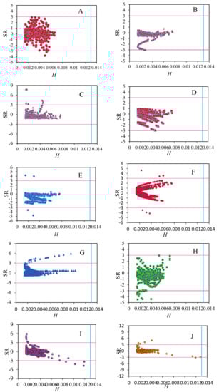 Outlier detection results for each model ((A): GA-SVM model. (B): Amin model. (C): Berger model. (D): Hammerschmidt model. (E): Towler model. (F): Motiee model. (G): Kobayashi model. (H): Ghayyem model. (I): Zahedi (3) model. (J): Zahedi (4) model).