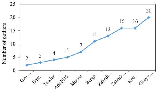 Artificial-intelligence algorithms have seen rapid development in recent years. Mohammadi et al. [] proposed a new technology that can efficiently detect the abnormal points of a model via the Rousseeuw outlier detection theory–Williams plate detection method. The basic idea is to use the H value of the hat matrix and the standardised deviation between the model experimental data and the calculated data with the H value as the abscissa and the normalised deviation as the ordinate. The calculations of the model are performed on the premise of setting the leverage value. Consequently, abnormal points are detected. The specific steps of its algorithm are as follows.