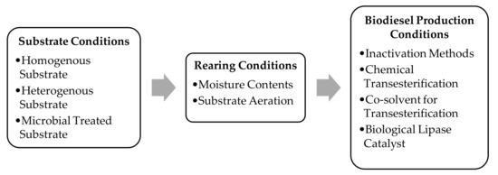 Flow of review, encompassing the larval substrate, rearing and biodiesel production conditions.