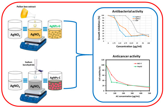 Graphical representation of green synthesized silver nanoparticles using pollen bee extract (AgNPs-G), chemical synthesized silver nanoparticles using sodium borohydride (AgNPs-C) and evaluation of their antibacterial and anticancer activity.