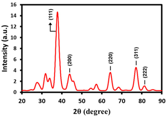 The formation and crystallinity of the as-prepared Ag NPs was also confirmed by using the powder diffraction technique. The XRD spectrum in Figure 3 indicates the presence of a face-centered cubic (fcc) structure for the Ag NPs. Particularly, the presence of distinct peaks at various positions, including at 37.75° (111), 44.41° (200), 63.83° (220), 76.95° (311), and 81.63° (222) clearly confirms the formation of Ag NPs. Among all the other diffraction peaks, the peak at (111) is the most intense peak, which may correspond to the direction of the growth of nanocrystals. In addition to the characteristic’s peaks of Ag NPs, the XRD pattern also contains various additional peaks. These peaks can be attributed to the inorganic residual moieties that may be present in the bee pollen grain extract. The residual compounds may have been bound to the surface of the NPs and thus, contributed to the additional reflections in the XRD pattern of Ag-NPs synthesized by bee pollen grains extract.