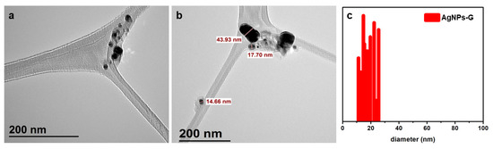 (a,b) TEM images of the green synthesized AgNPs-G using the aqueous extract of bee pollen grains, (c) particle size distribution of AgNPs-G.