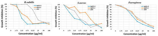 Antimicrobial activity of B.subtilis, S.aureus and P.aeruginosa by MIC50 method for AgNPs-G in comparison to AgNPs-C and ampicillin (AMP).