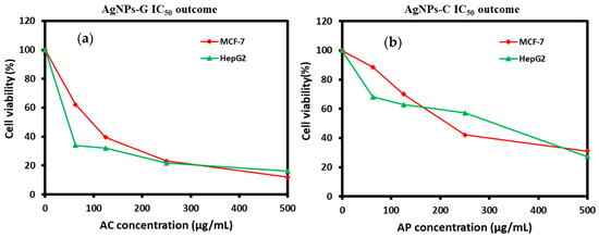 Viability outcome by MTT assay for (a) AgNPs-G and (b) AgNPs-C.