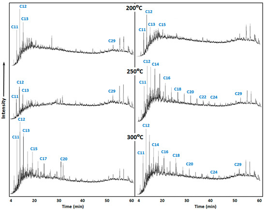 The results of MALDI (Figure 3) of resins after thermo-catalytic treatment at 200 °C show the shifting of a maximum of molecular mass distribution from 300 to 360 units due to the destruction of asphaltene molecules and their conversion into the resin fraction. At higher temperatures, part of the carbon-heteroatom bonds in resins breaks apart, the chemical force of which is higher due to the lower molecule size of the resins in contrast to the asphaltenes. For the rock extracts after thermo-catalytic treatment, the average molecular mass of resins decreases from 360 to 320 as the reaction temperature increases from 200 to 300 °C (Figure 3).