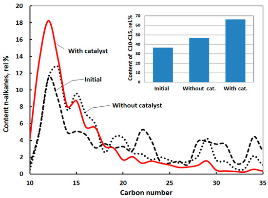 The content of light hydrocarbons in saturated fraction was increased after catalytic hydrothermal treatment (Figure 1) due to detachment of alkyl substitutes in resins and asphaltenes.