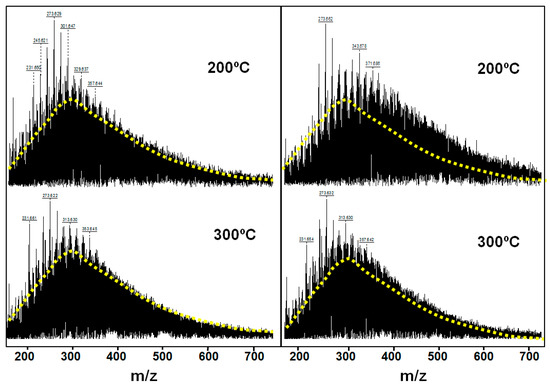MALDI spectra of resins from rock extracts under various influence temperatures for 12 h in the absence (left) and presence (right) of a catalyst. Punctuated lines indicate the distribution of molecular masses with respect to specters of experiments at 200 °C without a catalyst.
