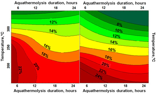 The influence of various reaction conditions (aquathermolysis duration and temperature of experiments) on the content of asphaltenes (wt%) in the presence (right) and absence (left) of a nickel-based catalyst.