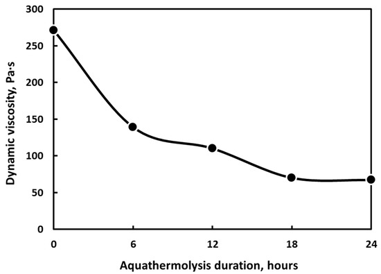 The rheology measurements at room temperature show that the viscosity of the given crude oil reduces upon the increase in hydrothermal treatment time (Figure 5). In contrast to the viscosity of the initial crude oil, the viscosity reduction rate after catalytic aquathermolysis treatment approaches 75%. This value is comparable with the results obtained by other groups of scientists [1,21,22]. Yusuf et al. synthesized oil soluble catalyst NiMo-oleate and applied it together with glycerol to upgrade Omani heavy oil by catalytic aquathermolysis. They also achieved maximum viscosity reduction of 69% at a 277 °C reaction temperature and 30 h of reaction [23].