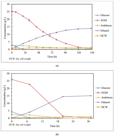 As observed, the simultaneous consumption of glucose and XGM was determined in the fermentation of both detoxified hydrolysates, although the consumption rate of XGM sugars by E. coli was also higher for the hydrolysate detoxified with activated charcoal. Simultaneous consumption of glucose and XGM by E. coli has also been reported in the fermentation of hemicellulosic hydrolysates from Agave lechuguilla [31], corncobs [33], and rapeseed straw [13]. It is worth mentioning that levels of arabinose identified in the EOP hydrolysates were not relevant (<9% of total sugars).