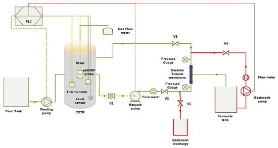 A laboratory-scale completely stirred tank reactor (CSTR) of 15 L effective volume (diameter × height = 120 mm × 650 mm), coupled with a mono-tubular ceramic microfiltration unit of 50 cm (HeFei ShiJie Membrane Engineering Co.Ltd, Hefei, China) (pore size × filtration area: 100 nm × 0.011 m2) was operated at the ambient temperature (26.68 ± 4.0 °C) as shown in Figure 1. The membrane was made of ceramic composite, Yttria and Zirconia. It was housed in a single tubular channel stainless steel housing and operated in the inside-out orientation. The feed pump (BT100-1L, Longer YZ1515x Pump, Hebei, China) was used to feed the influent into the AnCMBR. A Xin Xishan DP-35 diaphragm pump (Xin Xishan industries Co.Ltd, Shanghai, China) was used to feed the membrane and recycling retentate to the reactor. A back wash pump (25WZR-15, Xin Xishan industries Co.Ltd, Shanghai, China ) was used for back washing. The anaerobic reactor was equipped with a level sensor (AF-E2A3C1D1B2), pH sensor and oxidation reduction potential (ORP) probe (ACTEON5000, PONSEL group, Aqualabo Analysis, Caudan, France). A programmable logic controller (PLC) system (LAB VIEW, PLC, Siemens AG, Frankfurt, Germany) was used for automatic control of the setup operation. A biogas flow meter (μ-Flow, Bioprocess Control AB, Stockholm, Sweden) was used for monitoring biogas. A flow meter (NRLD-20, Ruiji automation company, Nanjing, China) was used to record the membrane flux.