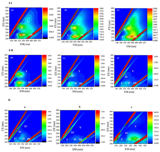 Fluorescence excitation–emission matrixes (EEM) of the selected samples and cleaning solutions. I–I: In the first backwashing (a) anaerobic sludge supernatant (b) permeate (c) backwashing solution. I–II: In the last backwashing (d) anaerobic sludge supernatant (e) permeate (f) backwashing solution. II: Chemical cleaning solutions (a) pure water (b) NaOCl (c) citric acid. Region I: tyrosine like proteins I; Region II: tryptophan like protein; Region III: fulvic acid-like (FA) substances; Region IV: soluble microbial by-product-like substances; Region V: humic acid-like (HA) substances [41].