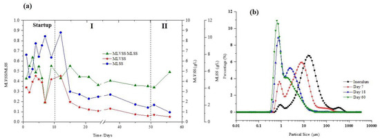 (a) Mixed liquor suspended solids (MLSS) and mixed liquor volatile suspended solids (MLVSS) (b) and particle size distribution (PSD) during reactor operation.