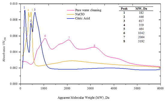 The molecular weight (MW) distribution obtained from High pressure size exclusion chromatography (HPSEC) analysis is shown in Figure 4. The fractions removed by pure water cleaning are attributed to the Peaks 6, 7 and 8 at 1042 Da, 2064 Da and 3192 Da, respectively. Pure water enabled cleaning of very high MW substances (polysaccharides and HA) [56] attached to the cake layer with its rapid flush. Fractions smaller than 700 Da have been removed by citric acid while fractions between 300 Da–400 Da have been removed by NaOCl. Then these peaks are attributed to the low molecular weight substances probably irreversible fouling layer generally resulting in pore blocking, and these results imply that NaOCl and citric acid are effective in removal of irreversible fouling. On the other hand, it denotes that low molecular weight fractions of the biopolymers are the major foulants of irreversible fouling and high molecular weight fractions have resulted in the reversible fouling in this study; 3D-EEM spectra of the citric acid solution further confirms this observation by representing significant peaks in Region II and III (tryptophan like proteins and FA-like substance). Both NaOCl and citric acid are effective at removing low molecular weight substances which mostly resulted in pore blocking. This indicated that the FA-like substances and HA-like substances were the main contributors of organic fouling in this study, confirming the results obtained by 3D-EEM analysis. Hence this part of organics might have more carboxylic groups and higher potential to adsorb on the membrane surface or inside the membrane pores. As Yttria composite ceramic membrane was used here, further analysis are suggested on membrane surface foulants interactions for fouling mechanism identification of Yttria-based ceramic tubular membranes.