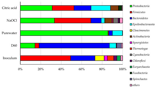 The growth of microbes on the membrane surface termed as biofouling is an Achilles heel of membrane processes which reduces the permeability and durability of the membrane while increasing the energy consumption [57]. Biofouling is inherently more complicated than other membrane fouling phenomena and its formation mechanism includes adhesion of bacterial cells on the membrane, and their growth, multiplication and relocation on the membrane surface [58]. This study applied 16 s rRNA identification of microbial foulants for a tubular ceramic membrane, which is rarely applied for biofouling investigation of AnCMBR. Herein a destructive membrane autopsy was not obtained, enabling the use of the membrane after chemical cleaning. Instead, the cleaning solutions were subjected to DNA extraction and further analysis. Figure 5 exhibits the community bar plot analysis at phylum level for cleaning solution and anaerobic sludge. In order to describe the microbial fouling mechanism in this study, the conceptual diagram by Dong, 2015 [59] on fouling was used as shown in Figure S5. Accordingly, the membrane fouling layer is divided into three parts as loosely attached cake layer, strongly attached cake layer and pore blocking. Pure water cleaning represents the dominant bacteria in the loosely attached cake layer, while NaOCl and citric acid represents the bacteria in the strongly attached cake layer and pore blocking.
