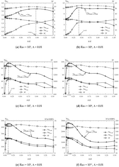 For low enough values of Λ, the influence of variable properties is negligible, and therefore the Boussinesq approach can be employed. In this work, this limit is achieved for the lowest value considered of the heating parameter, Λ = 0.01. For analyzing the variable properties effects, the range of values of Λ considered for numerical simulations is 0.01–10, which includes the whole range of typical situations.