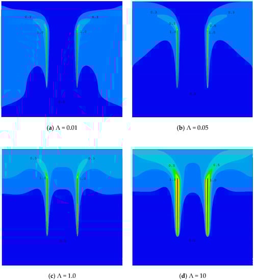 Figure 9 illustrates the thermal flow patterns that are found for two different Rayleigh numbers and two different aspect ratios. Here, it can be considered that results are obtained as the Boussinesq approach proposes since that Λ = 0.01, and therefore the air properties are considered almost constant. Note that for low enough values of Ra