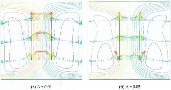 Figure 10, it is evident the progressive thickening of the thermal boundary layers adjacent to heated walls as Λ increases. The isotherms tend to occupy a larger portion of the cavity for higher values of Λ, and the Nusselt numbers at walls tend to decrease as a consequence of the generated thermal drag for intense heating conditions. This behavior is accompanied by a relevant change in the velocity field of airflow, which can be observed in