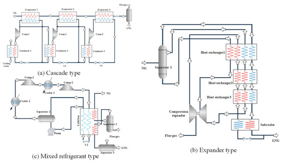Schematic diagrams of three natural gas (NG) liquefaction processes. (a) Cascade type; (b) expander type; (c) mixed refrigerant type.