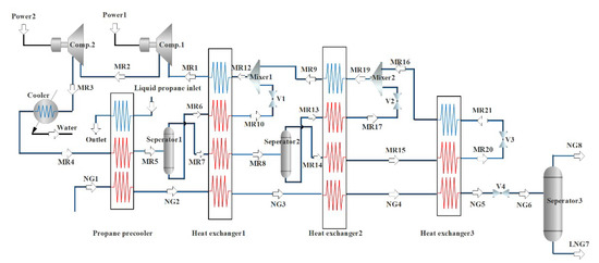 Secondly, the propane precooling system is shown in the Figure 2 as a three-step heat exchanger. NG-1 is cooled by the propane pre-cooling, heat exchanger 1 (high-temperature heat exchanger), heat exchanger 2 (medium-temperature heat exchanger), and heat exchanger 3 (low-temperature heat exchanger). Then it is throttled and depressurized by the throttle valve V4, and enters separator 3. Then the normal pressure LNG product is obtained at the bottom of separator 3 for subsequent storage and transportation. Thirdly, the mixed refrigerant is compressed to a high pressure by a two-stage compressor, and it is cooled with water to take away a part of the heat. Then, it is pre-cooled by a propane pre-cooling cycle. After the pre-cooling, it enters gas–liquid separator 1 and becomes the liquid phase and the gas-phase. Heat exchanger 2 is provided with a cooling capacity. The NG and the mixed refrigerant in the gaseous and liquid phases exiting separator 2 are cooled. The gas-phase refrigerant coming out of heat exchanger 1 is cooled by heat exchanger 2 and then throttled and cooled to enter heat exchanger 3 to cool the NG and gas phase mixed refrigerant. The cooling capacity of the above heat exchangers 1, 2, and 3 is provided by a mixed refrigerant cycle consisting of N2, CH4, C2H6, and C3H8. The low-pressure gaseous mixed refrigerant MR1 from heat exchanger 1 is first compressed in the compressor. It is cooled to high pressure by propane pre-cooling to enter separator 1, and then separated into a liquid phase MR6 and a vapor phase MR7 in separator 1. After the liquid phase is produced, MR6 is subcooled by heat exchanger 1, the throttling refrigeration becomes MR12. Similarly, the vapor phase MR14 enters heat exchanger 2 after cooling and liquefaction, subcooling, and throttling cooling. After cooling and reheating, it becomes MR19. Finally, the MR9 is mixed with the previous MR10 into heat exchanger 1 to provide a cooling capacity, and the reheated gaseous mixture MR1 is re-entered into the compressor inlet to complete a refrigeration cycle.