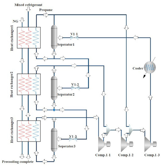 Figure 2 is a NG liquefaction flow chart of the system process. The process consists of three parts, i.e., the propane pre-cooling cycle, the NG liquefaction flow path, and the mixed refrigerant circulation circuit. In this liquefaction process, the propane pre-cooling cycle is used to pre-cool the mixed refrigerant and NG, and the mixed refrigerant cycle is mainly used for the liquefication of cryogenic NG. The detailed process can be divided into three parts. Firstly, a brief introduction to the propane pre-cooling cycle is provided, as shown in Figure 3. Propane passes through three temperature zones in the heat exchangers to provide cooling for NG and mixed refrigerants. The propane is successively compressed by the compressor to a high temperature and high pressure, cooled by the cooling water, passed through a throttle valve to reduce the temperature and pressure, and then produces two phases (i.e., gas and liquid) in a separator. The gas phase returns to the compressor, and the liquid phase is divided into two parts. Part of the liquid is used to cool the NG and the mixed refrigerant, and the rest liquid is used as the refrigerant in the subsequent processes. Since the propane pre-cooling process is an auxiliary process of natural gas liquefaction in this paper, for details, please refer to the literature [36].