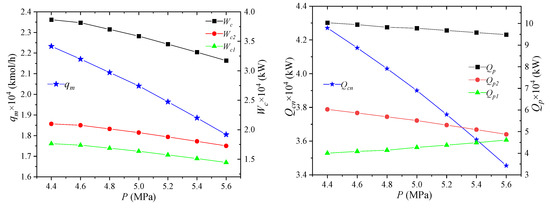 The effect of NG pressure on the process performance is shown in Figure 4. When the pressure of the NG entering the liquefaction process increases, the enthalpy value of the NG inlet state will decrease, due to the increase of the NG pressure, leading to the decrease of the enthalpy difference between the NG inlet state and the liquefied state. Thus, the cooling capacity Qcn required by LNG is reduced. The parameters of the circulating mixed refrigerant are unchanged, the unit enthalpy of each node is unchanged, and the required mixed refrigerant flow qm will be reduced. When the parameters of the mixed refrigerant cycle are the same except for the total flow rate, the unit enthalpies of the compressor inlet and outlet state points are unchanged, and the total flow rate is reduced, and the power consumptions Wc1, Wc2, Wc of the high- and low-pressure compressors are all reduced. When the inlet pressure of NG increases, the enthalpy difference between the same temperature difference in the gas phase region increases. Since the increase is small, the pre-cooling amount Qp1 will increase slightly when the NG flow rate is unchanged. For the cooling capacity Qp2 of the propane pre-cooled mixed refrigerant, the unit enthalpies of the state points MR4 and MR5 are unchanged, but the total flow rate is reduced. As a consequence, the cooling capacity is reduced. The combined effect of these two effects reduces the total propane pre-cooling amount Qp.