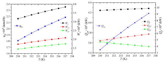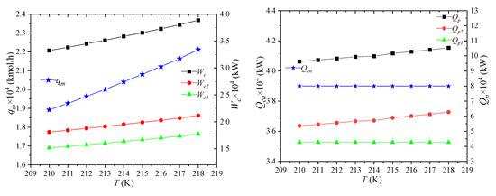 The effect of NG temperature on the process performance is shown in Figure 5, which refers to the temperature of NG after it has been pre-cooled by propane, i.e., the temperature of NG2. As the temperature of NG increases after propane pre-cooling, the enthalpy of NG entering the system will rise, but the states of LNG7 and NG8 remain unchanged. It can be obtained that the unit enthalpies of MR1 and MR5 stay the same, and the mixed refrigerant flow rate qm will increase. As the enthalpy of NG2 increases and the enthalpy of NG5 keeps constant, the amount of required cooling qcn increases, which is negative for the economics of the process. Therefore, before entering the process, the NG must be pre-cooled with propane, which is also the major reason of using propane. The enthalpy of NG1 remains unchanged, the enthalpy of NG2 increases, and the cooling capacity Qp1 provided by propane precooling for NG decreases. The cooling capacity Qp2 provided by the propane precooling for the mixed refrigerant will correspondingly increase. This combined effect causes the heat Qp taken away by propane to slightly increase. It shows that, as the temperature of NG2 rises, the percentage of cooling provided by the pre-cooling cycle for the NG decreases.