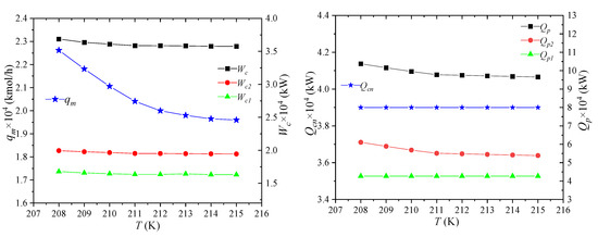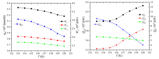 Table 4 shows the exergy losses of the main equipment in the process. It can be found that the losses mainly occur in the compression and heat exchange processes. The loss of the throttle also accounts for 25.9%, and the loss of the throttle valve 4 is the largest during the throttling process. The outlet state of the throttle can be changed by adjusting the storage conditions of the LNG. However, the pressure of NG storage is limited by the pressure of the storage tank materials. Therefore, this article adopts the method of changing the storage temperature, which can be achieved by reducing the flow of NG or the entropy value after NG throttling. The lower the NG storage temperature is, the smaller the NG flow rate becomes. Under the condition that the NG flashes with gas–liquid two-phase production, the minimum temperature that can be obtained for NG storage is 114 K.