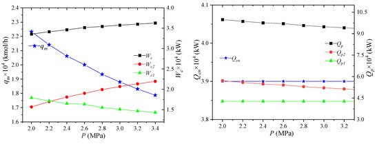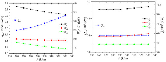 The pressure of the low-pressure mixed refrigerant refers to the pressure of the mixed refrigerant out of the node MR1 in heat exchanger 1. Its effect on the process performance is shown in Figure 8. When the pressure of the low-pressure refrigerant increases, the enthalpy of the low-pressure refrigerant per unit flow rate decreases, and the flow rate qm of the mixed refrigerant increases. Since the mixed refrigerant provides the same amount of cooling capacity for NG, the required cooling capacity Qcn of NG after three multi-stream heat exchangers remains unchanged. For the power consumption of the mixed refrigerant cycle compressor, the increase in the pressure ratio of the low-pressure refrigerant causes the decrease of the compressor pressure ratio, which can reduce the power consumption per unit flow rate. The increase in the refrigerant flow rate enhances the precooling capacity of the propane precooling mixed refrigerant, and the total precooling capacity Qp of the propane increases as well.
