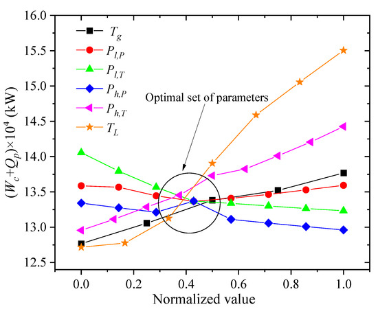 For the process analyzed in this paper, reducing the compressor power consumption and increasing the output of LNG are the major optimization goals. According to the sensitivity analysis of liquefaction process parameter in this article, the sum of the power consumption of the compressor Wc and the precooling amount Qp of the propane are the minimum objective function. Table 5 and Figure 12 show the relationship between the change of each parameter and the change of the objective function. The symbols Tg, Pl,P, Pl,T, Ph,P, Ph,T, and TL represent the NG temperature, low-pressure refrigerant pressure, low-pressure refrigerant temperature, high-pressure refrigerant pressure, high-pressure refrigerant temperature, and LNG storage temperature, respectively. When one of the process parameters changes, the objective function will rise or fall accordingly. In this paper, the normalized data processing is used to scale the related independent variable process parameters into the range of 0 to 1. The comprehensive influence of the above six process parameters on the objective function is obtained, and the optimal value interval of the process parameters is found. To achieve the smallest objective function, the best parameters obtained are listed as follows. The pressure of NG is 5 MPa, the temperature of NG after propane pre-cooling is 212 K, the pressure of the low-pressure refrigerant is 263 KPa, the temperature of the low-pressure refrigerant is 209 K, the pressure of high-pressure refrigerant is 2.7 MPa, the temperature of high-pressure refrigerant is 212 K, the storage temperature of NG is 114 K, and the storage pressure is 120 KPa.