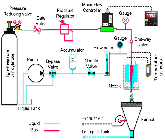 The liquid was driven by a commercial plunger pump (AR-RC 14.16 N, Modena, Italy) through a cylindrical accumulator used for damping the flow fluctuations. Sets of devices such as a needle valve for volume flow adjustment and a rotameter (DK800, KROHNE, Duisburg, Germany) were used. Rotameters with measuring ranges of 0.25–2.5 L/h, 1.2–12 L/h, 4–40 L/h, and 16–160 L/h were used for measuring the liquid volumetric flow rate with an accuracy of ±2.5% of the measuring value. The pressure gauge was fixed to measure the liquid pressure, as shown in Figure 1. The flow directed to the nozzle was controlled by a bypass valve. The pressurized air was delivered from a high-pressure air cylinder, passed through a gate valve, a pressure regulator used to control the ∆pmix/pamb. A Bourdon pressure gauge (ZYIA, Zhejiang, China, accuracy ±1.6% of the full scale) was fixed very close to the nozzle in order to measure the gas pressure. A non-return valve was used for the prevention of the water backflow to the gas line. A thermal mass flow controller (YJ-700CF—Air—10–500 SCCM, and YJ-700CV—Air—0.5–25 SLPM, Nanning, KONXIN, China, accuracy ±1% of FS) measured the gas mass flow rate. The funnel collected the sprayed liquid. Two K-type temperature sensors were located after the pressure gauges and used for measuring the gas and liquid temperatures.