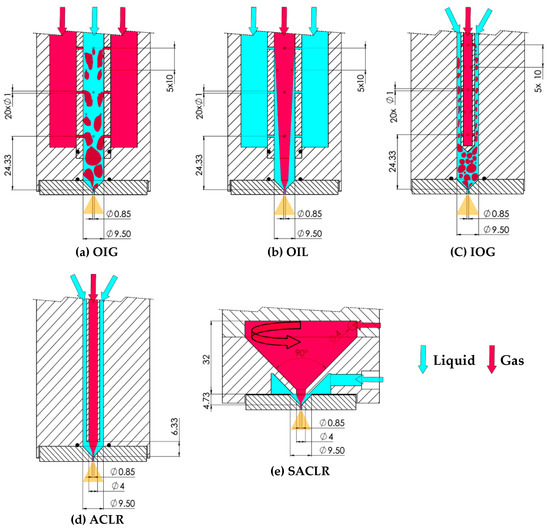 The geometry of the tested internal-mixing twin-fluid (IMTF) nozzles with their main dimensions in mm: (a) outside-in-gas (OIG); (b) outside-in-liquid (OIL); (c) inside-out-gas (IOG); (d) air-core-liquid-ring (ACLR); (e) swirling-air-core-liquid-ring (SACLR).