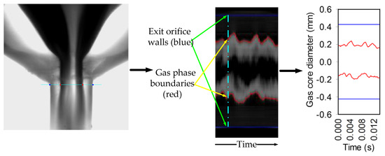 For each case, 250 flow visualization images were captured and processed, and this number was found sufficient for the minimization of bias errors in the measurement. Thereafter, MATLAB software was used for determining the gas phase boundaries at the entrance of the exit orifice and subsequently determining the diameter of the gas core (see Figure 3). The gas core diameter was used to measure the time variation of the gas phase inside the exit orifice, which corresponds with the internal flow regime [51,52]. Additionally, this diameter can be used to indicate some parameters for the gas–liquid flow (i.e., the gas void fraction and the corresponding slip ratio), as represented by Equations (5)–(8).