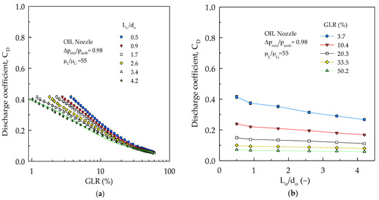 The effect of both GLR and Lo/do on the CD of the OIL nozzle is shown in Figure 4. It is clear that CD features a sharp decrease when increasing the GLR to ≈30%, while a further GLR increase has little effect on CD (see Figure 4a where the absolute values for the CD are documented). This behavior results from the link between the GLR and the flow area occupied by the liquid inside the exit orifice [26]. The actual area available for the liquid flow decreases with any increase in the gas flow rate (i.e., with increasing GLR). It is apparent that the discharge coefficients of the twin-fluid atomizers are, due to the gas blockage, lower than that reported for plain-orifice atomizers and single-fluid nozzles [53], simplex [54], and even spill-return pressure-swirl atomizers [55]. It moreover drops down below 0.1 for GLRs increasing above 10%. Figure 4b documents that, with a constant GLR, CD decreases with an increasing Lo/do ratio. Here the friction force on the liquid flow plays a role, as it is proportional to the exit orifice length.
