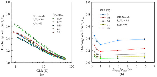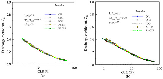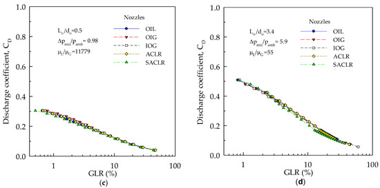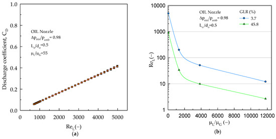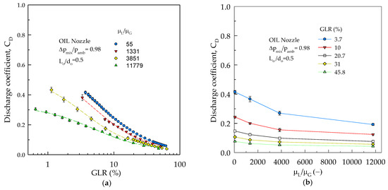 The effect of viscosity on the CD of the OIL nozzle is shown in Figure 7. CD decreases as the µL/µG increases at constant GLRs, as shown in the figures. This effect can be interpreted via the relation between CD and the Reynolds number for the liquid flow (ReL) (Equation (15)):