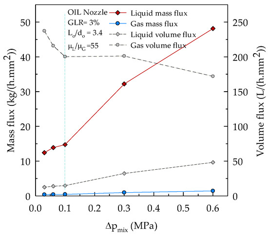 The effect of ∆pmix on the mass and volume fluxes at a constant GLR for the OIG nozzle.