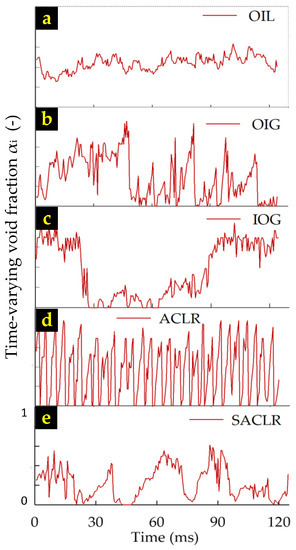 Figure 10 shows the character of αi at the entrance of the exit orifice for the tested nozzles at the given condition (i.e., GLR = 1.2%, ∆pmix/pamb = 0.98, and µL/µG = 55). The variation in the character of αi between the tested atomizers is certainly related to the nature of the internal flow regime inside the mixing chamber. It is clear in Figure 10a–e that αi is not stable and features a different character for each nozzle, which means the internal flow regime inside each nozzle is quite different from the others. This also indicates that the internal flow of these nozzles is inherently unsteady, but with varying levels. Only the exit orifice for the OIL nozzle continuously possesses an annular flow, while the other nozzles possess different flow regimes.
